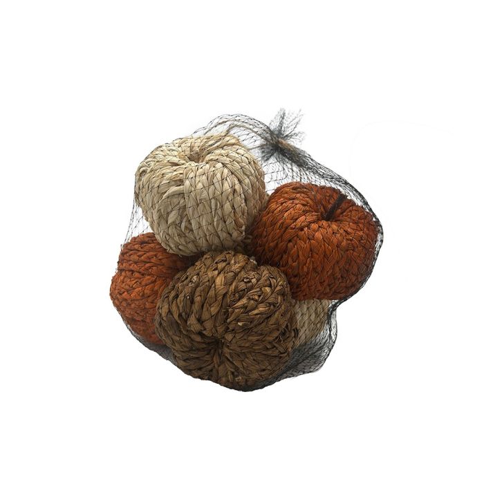 Autumn with decorative pumpkins in braided corn leaves. The net contains 6 pumpkins of approx. 10 cm in diameter in beautiful autumn colours: orange, off-white and brown. The combination of the natural materials and the warm shades gives a rustic look that is well suited to autumn and winter. The pumpkins are perfect as table decorations on decorative dishes or as filling in baskets, where they can be combined with fairy lights, leaves, pine cones or other seasonal elements. They can also stand individually on the windowsill or as part of a cozy autumn display. Since the pumpkins are made of braided corn leaves, they have a natural and handmade look, which makes each one unique.