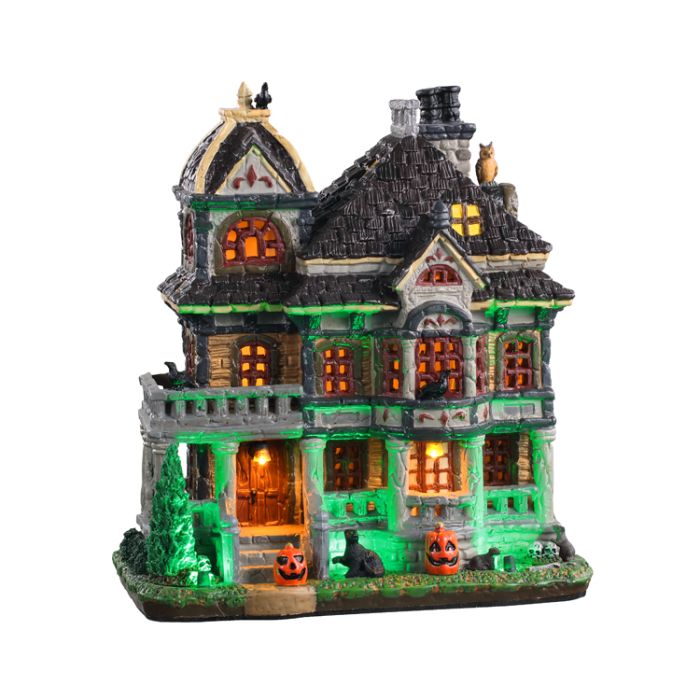 Grimsbury Haunted House. Large, haunted house with illuminated windows and doors. Outside, there are pumpkins and cats that are walking. It uses a 4.5 V adapter, which is included.