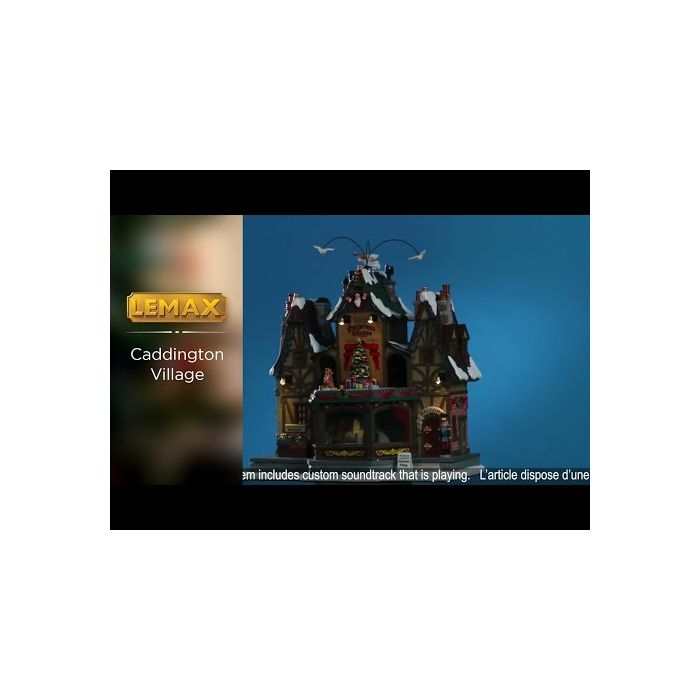 Hamlet's Christmas shop. A fantastic Christmas shop. A flock of pigeons is flying around in the air. Santa Claus and his reindeer revolve around the Christmas tree in the middle, and you can see through the windows of the Christmas shop. There is plenty of light everywhere and many details and finesse. As part of the "Caddington village" series, it comes in a nice Lemax box. It uses 3 x 1.5 V batteries (AA). The batteries are not included. It can also be connected to a 4.5 V adapter.