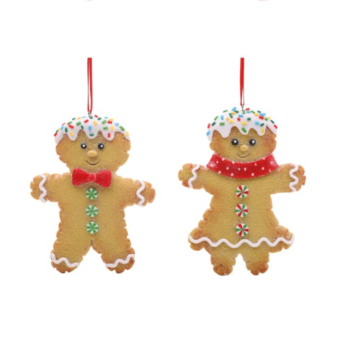 Smiling gingerbread cookies in a lifelike version with icing hair and candy buttons. Cute as decorations on branches or Christmas trees. Can also be placed as table decorations. Choose between a cake man or a cake woman.