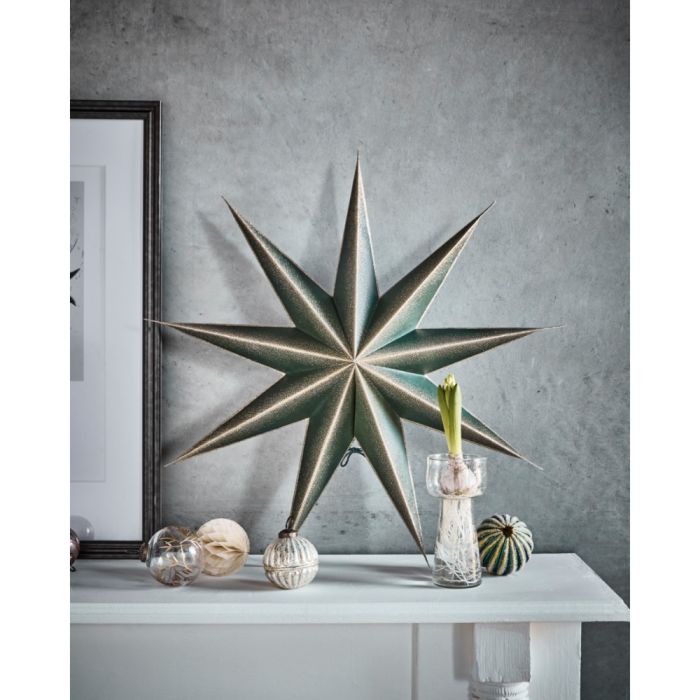 Stylish, dark green star with champagne-colored details from House Doctor. Stars are beautiful eye-catchers in windows, where the daylight makes the champagne-colored details shine. You can also hang it from the ceiling, where it can really spin around, or simply as a nice detail on the wall. The star is suitable for putting lights in and is available in two sizes.