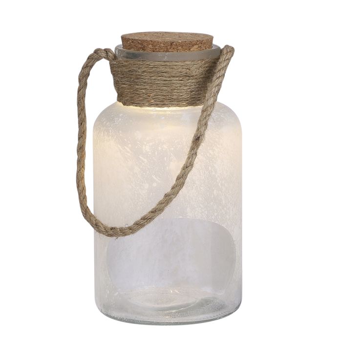 Frosted jar with cork stopper and LED lights. Battery-powered (batteries not included). It measures: L: 0 cm x H: 27 cm x D: 14 cm