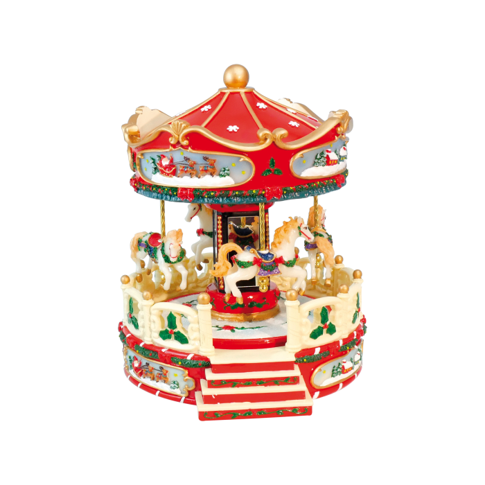 Christmas carousel. Christmas carousel with 4 horses and lights, playing 8 different Christmas melodies, while it spins. The melodies can be selected. The carousel is battery powered (batteries are not included). It measures 25 cm in height.
