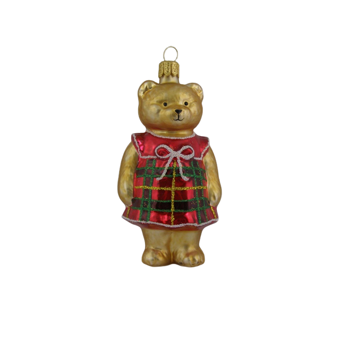 The checkered mother bear Christmas ornament is made of real glass from an Austrian glass factory called Hanco. The checkered mother bear Christmas ornament measures W: 6 cm x H: 9 cm.