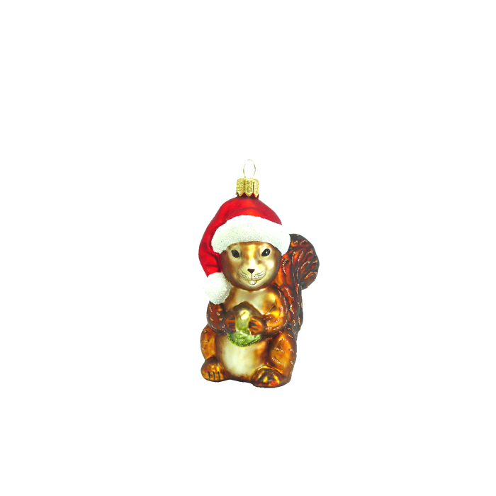 Squirrel with Santa hat Christmas ornament. Made of glass. The squirrel is wearing a large, red Santa hat with a white brim and is holding a small green nut in its paws. The squirrel measures 8.5 cm in height.
