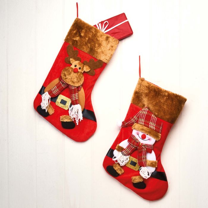 Christmas stocking with fur. Available in 2 variants: snowman or reindeer motif. Classic red Christmas stocking with soft, brown fur. It measures 42 cm in height.