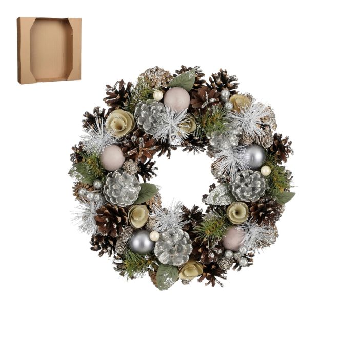 Wreath with various natural and silver-colored pine cones, berries, artificial greenery and white/silver-colored, matte Christmas balls. Very nice composite color expression. Can be hung on vertical surfaces and placed on tables, sideboards, etc., for example with a block candle in the middle.