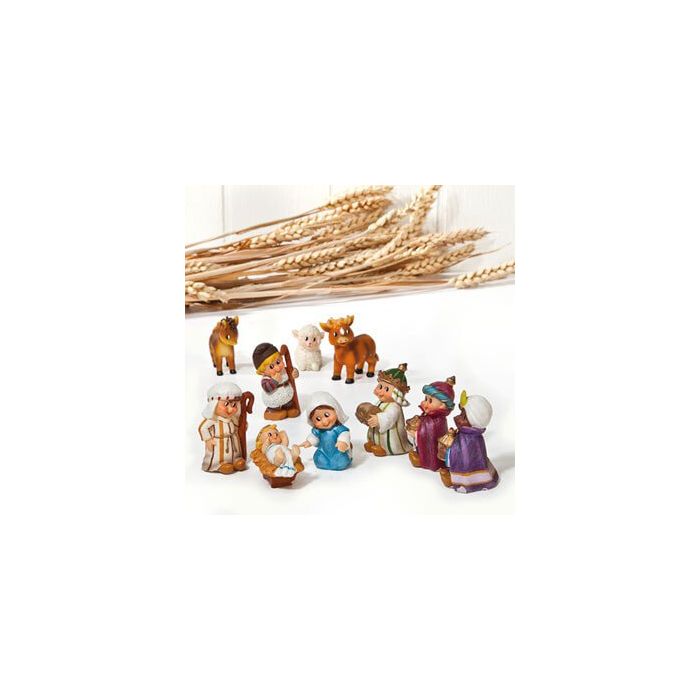 Nativity scene with 10 figures. The figurines have a height of approx. 4 cm. The figurines have child-friendly faces.
