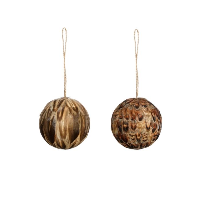 Ball-shaped ornament made of natural, brown feathers with string for hanging on branches, in windows or on the Christmas tree. The feathers vary in colors and patterns.