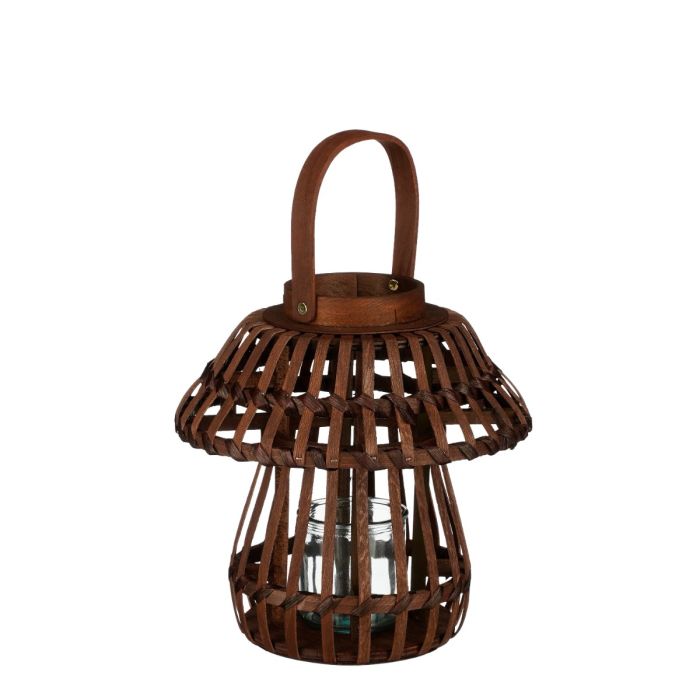 Cozy lantern for the terrace or as an autumn decoration in front of the front door. The lantern is mushroom-shaped from poplar wood slats and has a small glass holder for tea lights or small block candles in the middle. The dark brown, earthy color blends in naturally with the colors of the garden.
