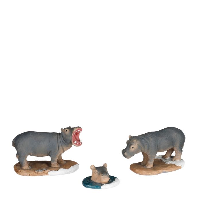 At Luville Zoo lives the hippopotamus family, which includes 3 members. For the visitors, there is always something interesting to look at. The hippo father likes to show off his biting skills, while the lively youngster takes a dip every now and then. The hippos have fine details, such as their skin's texture, which is noticeable. The hippopotamus family belongs to the Luville Zoo series, which features a range of wild animals.
