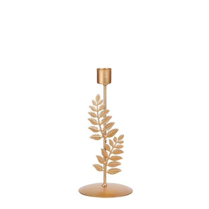 Candle holder made of golden metal with decorative leaves. Available in two sizes.