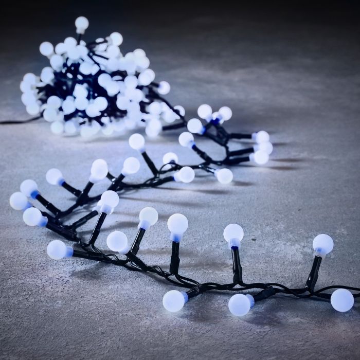 String lights with white berry-like bulbs. There are 550 LED lights on a 1400 cm long wire. The bulbs are spaced 2 centimeters apart. The string lights can be set with 8 different light functions and with a timer function (6 hours on/18 hours off). It can be set up both indoors and outdoors.