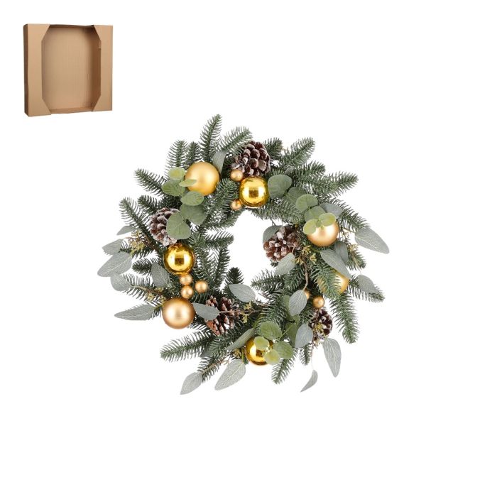 A beautiful artificial fir wreath with dusty green leaves, shiny and matte golden Christmas balls and flocked fir cones. Hang it, for example, on the main door and place it on a table.
