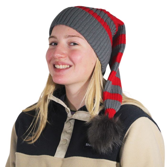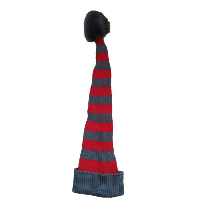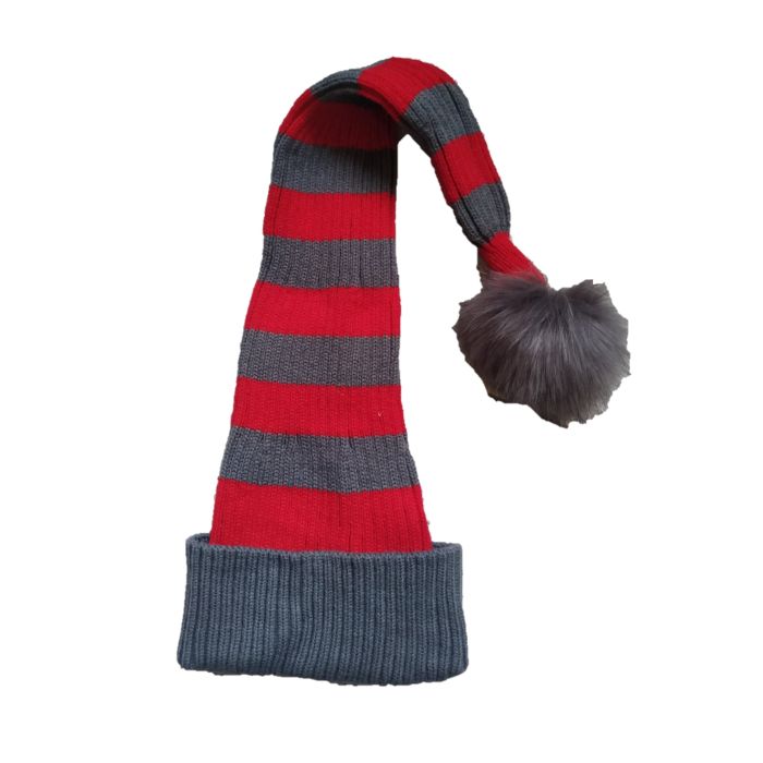 Soft yarn striped Santa hat that is finely knitted. Good quality Santa hat. The Santa hat is very comfortable to wear and adapts to any head size. The Santa hat is red and gray striped with a gray brim and a soft round gray fur tassel. The Santa hat can be used on all cold days, warming the ears well. It iis a must-have Santa hat that can be used year after year. The Santa hat measures 67 cm in length from the top of the tassel to the bottom of the brim.