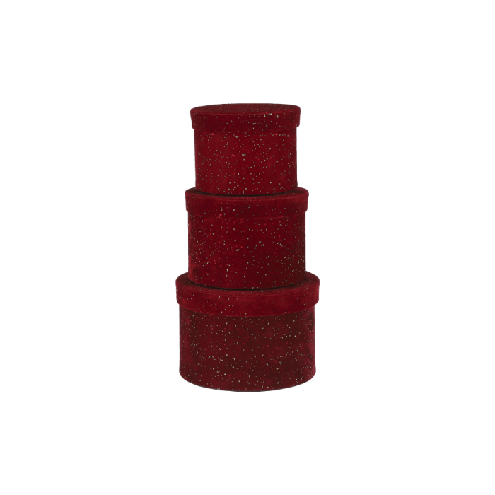 3 red storage boxes. Nice, soft fabric boxes with small golden stars. The boxes are round and come in 3 sizes.