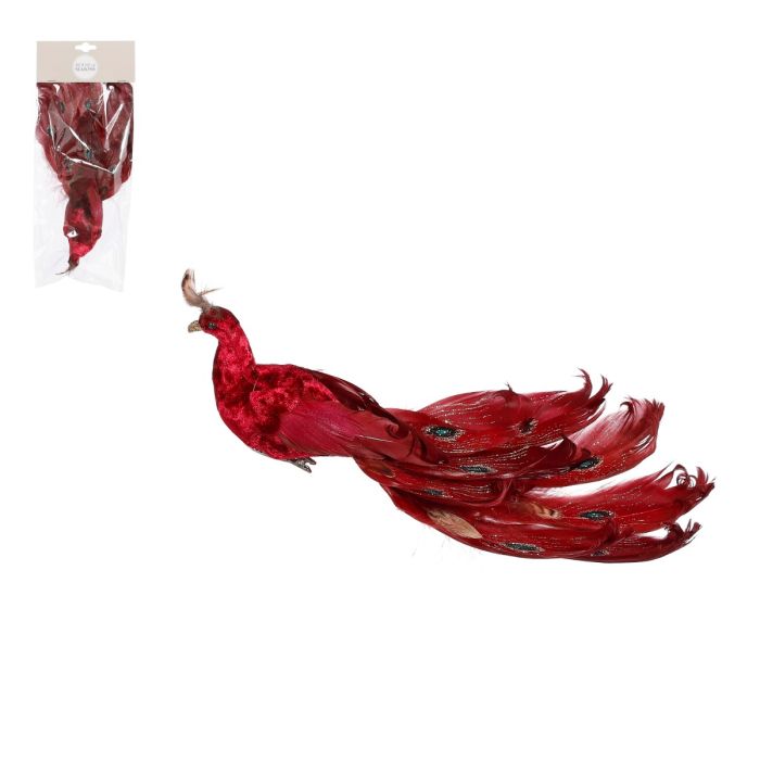 Dark red peacock with velvety body and long plumage with a peacock pattern and glitter. The peacock has a metal clip, so it can easily be attached to spruce branches.