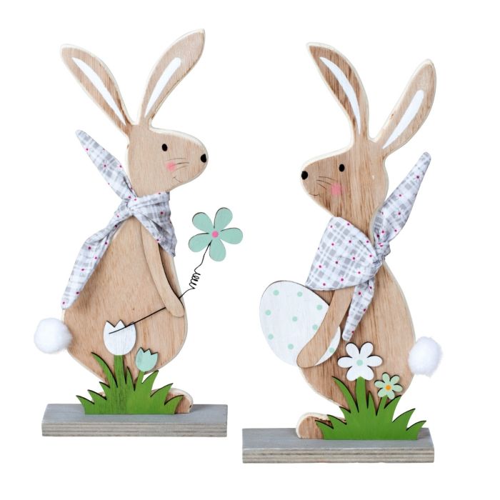 Easter bunny carved in wood, with a patterned fabric scarf and either a flower or an egg in its paws. Both Easter bunnies have soft, white tail pom-poms. The Easter bunnies are in subdued colors. They make a lovely decoration for the Easter table.