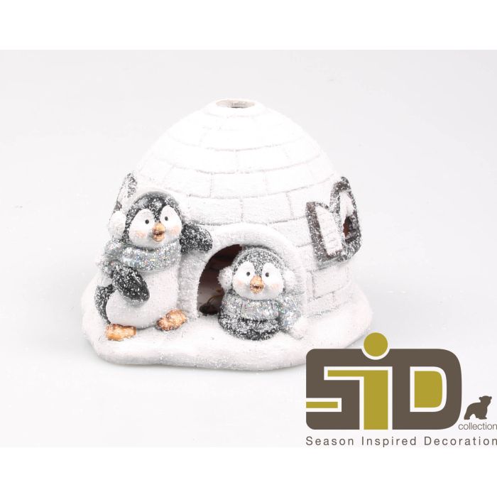 Penguins with igloo. Adorable penguins dressed for the snowy weather with igloo. Made of polyresin. It measures 19.5cm x 18cm x 14cm.
