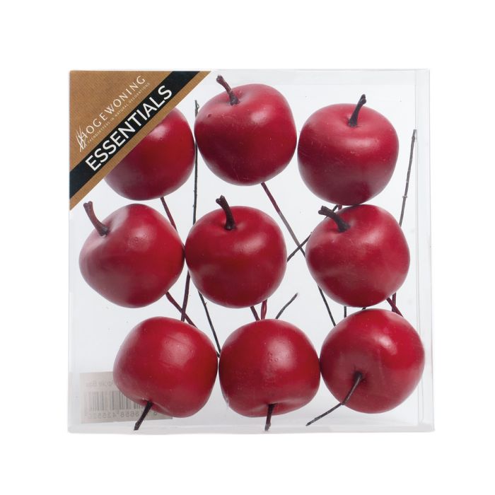 Red apples with wire. Red apples with a small stem and a metal wire to stick into the wreath, clay, ground, etc. The apples measure 4 cm in diameter. There are 9 apples per bag. Made of styrofoam, plastic and metal.