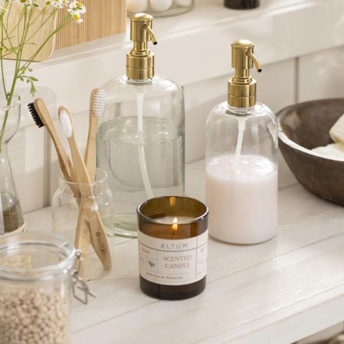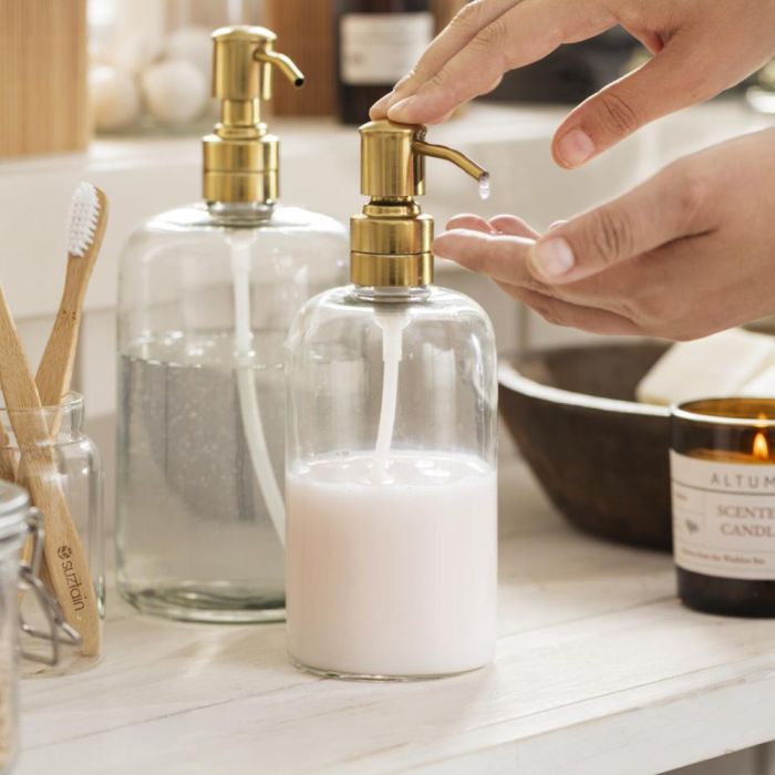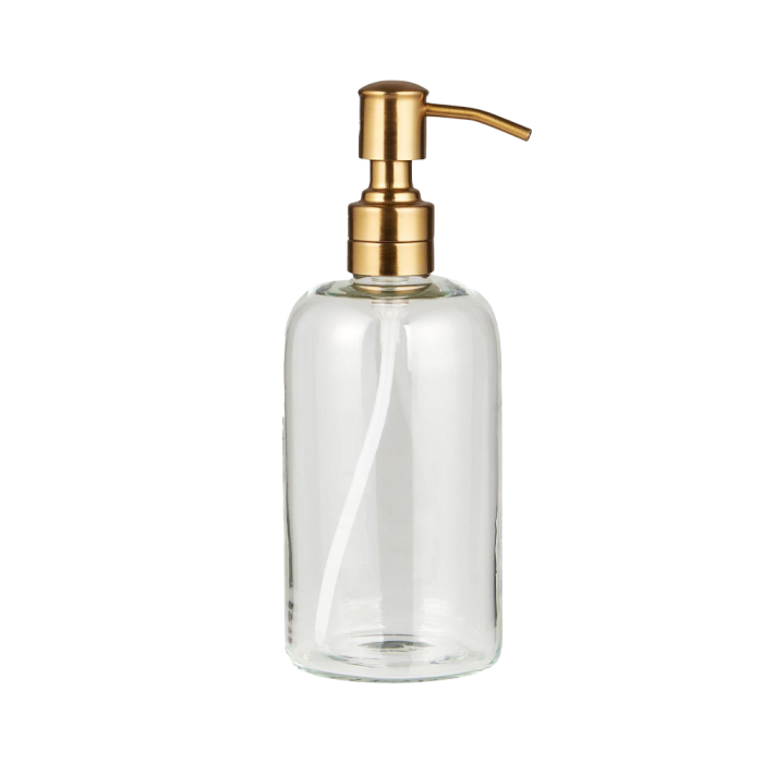 Soap dispenser in clear glass with brass-colored stainless steel pump head from Ib Laursen. The soap dispenser has a particularly robust pump head that ensures easy dosing. The soap dispenser is a nice detail in the bathroom, and it can also be filled with cream, shampoo, etc. to create a uniform and stylish look.