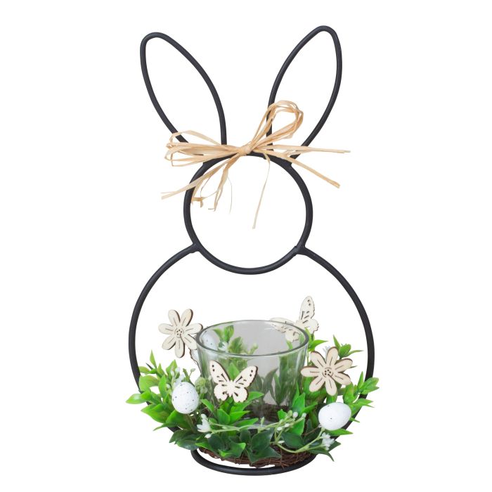 Silhouette tealight candle holder. Made of metal. It has a glass tealight holder. The candle holder is shaped like a hare with prickly ears with a small bow on it. There are small flowers, green leaves, butterflies and eggs. It measures 25 cm in height.