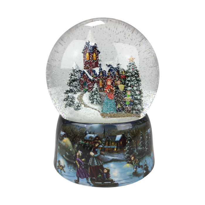 Church snow globe. In the snow globe, there is a choir singing in front of a snow-covered church. The ball's base has a skating motif and a city in the background. If the mechanical music box is switched on, the snow is automatically blown around and "Joy to the world" is played. The diameter of the snow globe is 15.4 cm and it has a height of 20.3 cm.