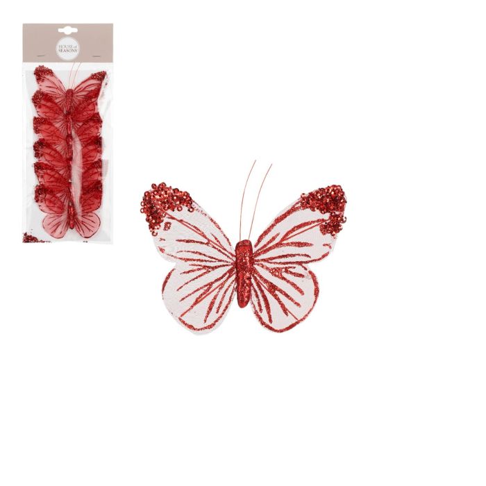 Red butterflies with fine wings with a red glitter pattern. The butterflies have a small clip so they can be easily attached to napkins, branches or in decorations.