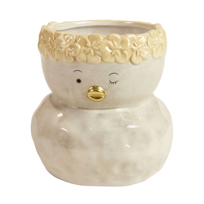 This flower pot hider from Speedtsberg brings a gentle and spring-like atmosphere into the home and fits particularly beautifully into Easter decorations. The duck shape has a quirky and friendly expression, where the characteristic eyes and the gold-colored beak create life and personality. The light gray base combined with the light yellow shades and the decorative floral pattern at the top give the hider a warm and harmonious expression, which brings to mind spring, light and new beginnings.