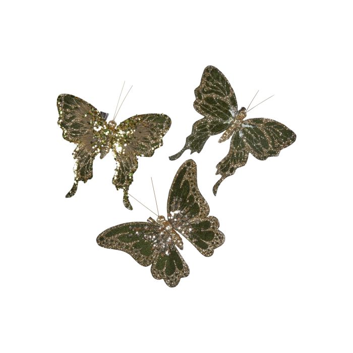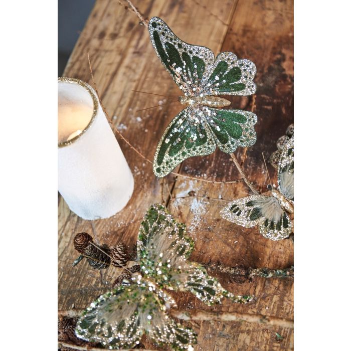 Butterflies in shades of green with beautiful decoration from Speedtsberg. The butterflies have clips so they can be attached to branches, wreaths, decorations, napkins, etc. The butterflies are sold assorted with small differences in color shades and decoration, see photo.