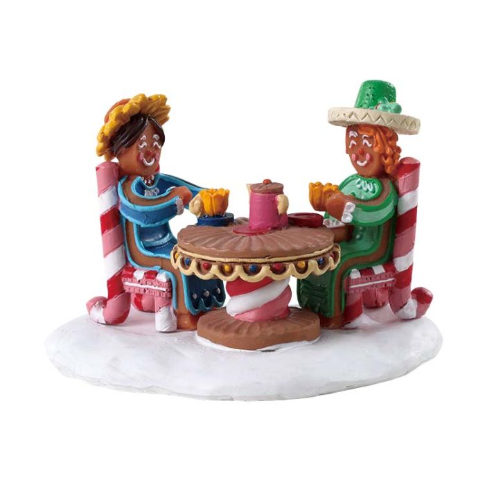 Sitting on the most delightful candy cane chairs, the two gingerbread figures are enjoying a cup of tea and a piece of cake.