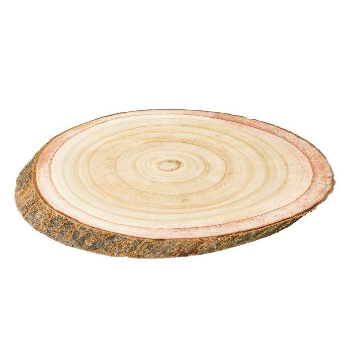 Medium wooden disc with annual rings. Medium wooden disc with annual rings and bark. It measures 32cm x 22.5cm x 3cm.