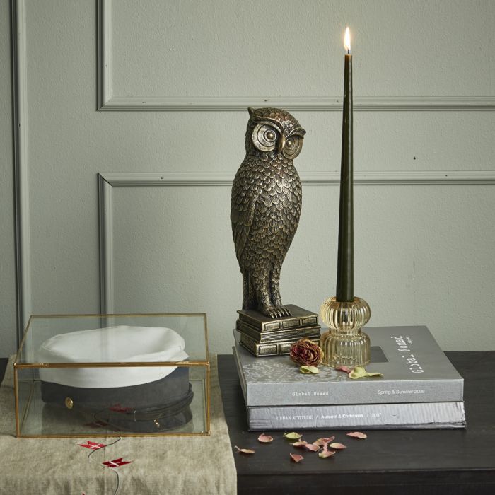 Gold-colored owl with beautiful feather structure and a small stack of books under its claws. The figure is from Speedtsberg's series of applied art for home decoration.